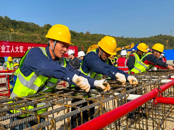▲鋼筋綁扎比賽現(xiàn)場(chǎng) 攝影:黃欣