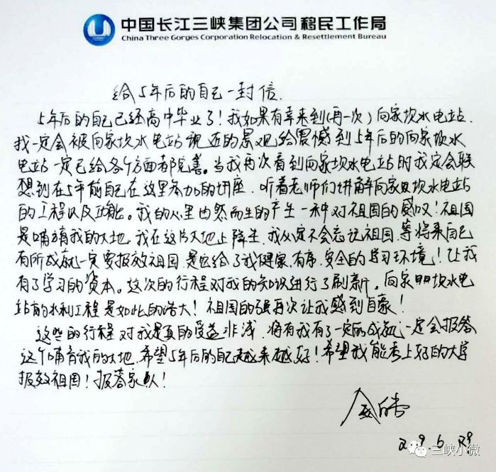 參加此次活動的50名中學生,正值愛做夢的年紀,理想的種子正在萌芽。為了激發他們為理想不懈奮斗的熱情,志愿者組織同學們給五年或十年后的自己寫一封信,對話未來的自己,規劃自己的未來。這一環節中,岳子豪同學作為參加過往屆娃娃行活動的學生代表做了發言:“是向家壩電站建設的叔叔阿姨用辛勤的汗水換來了我們今天的幸福!我一定要努力學習,將來也要成為一名水電建設者,為祖國作貢獻!”