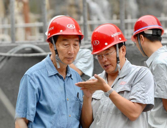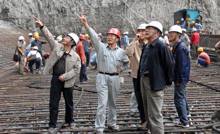 中國工程院院士、原三峽總公司總經(jīng)理陸佑楣(左)和汪志林在溪洛渡建設(shè)現(xiàn)場(chǎng)討論。
